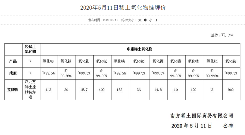 中国南方稀土集团南方稀土国际贸易有限公司公布最新中重稀土氧化物挂牌价格,部分氧化物价格价格上调。